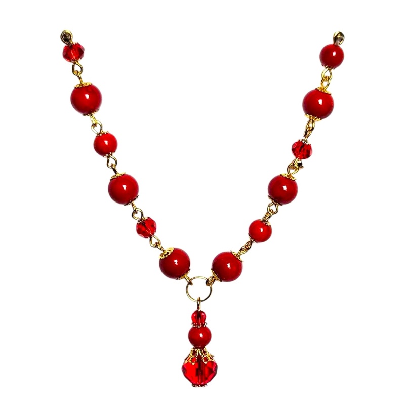 Fossiil toonitud, 6 ja 8mm; klaasrondellid punased, 6x4mm.