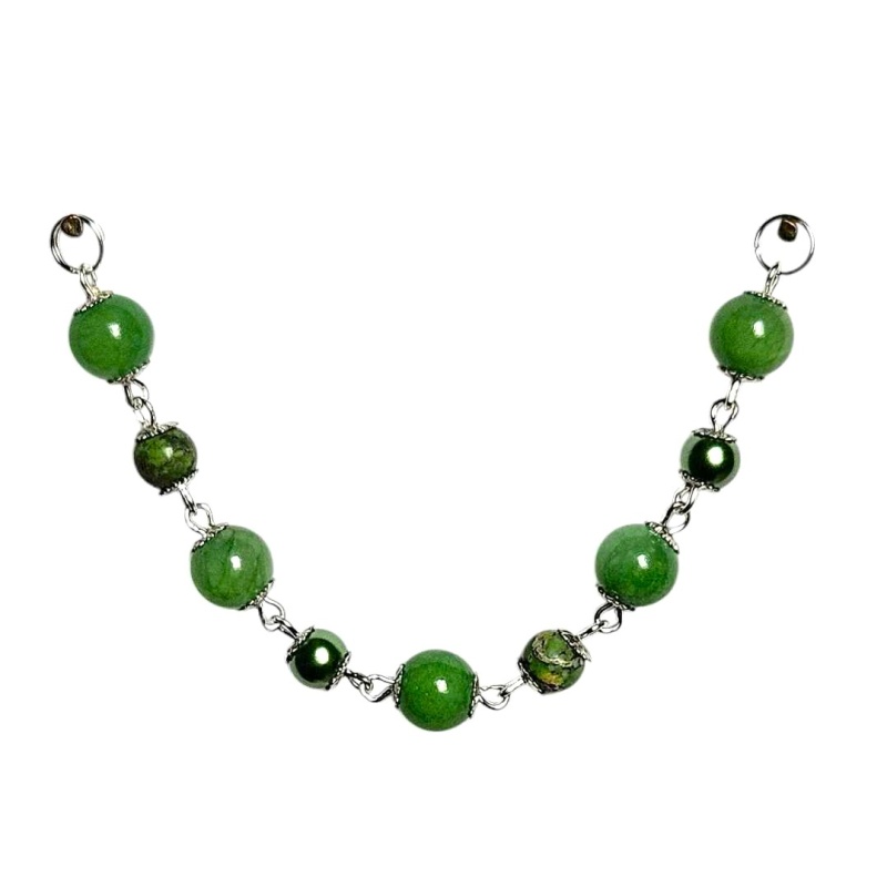 Nefriit toonitud, 8mm; roheline jaspis, 6mm; klaaspärlid rohelised, 6mm.